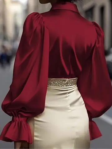 New Stylish Solid-colored Bubble Sleeve Long-sleeve Lapel Satin Shirt For Commuting
